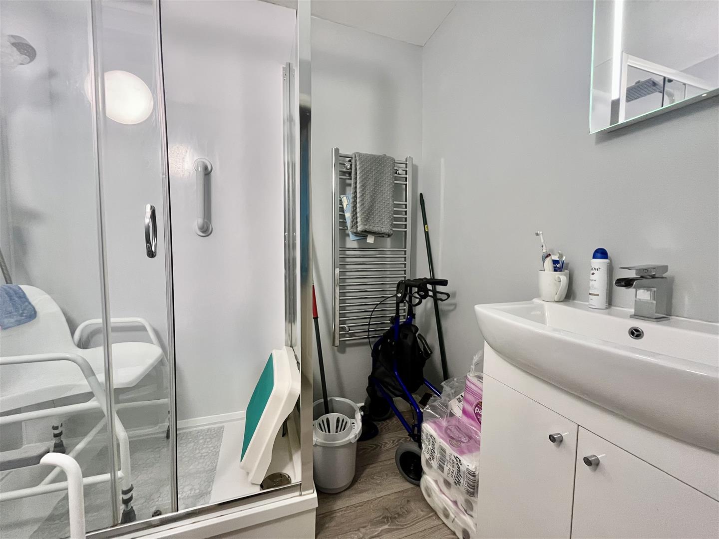 SHOWER ROOM - Double shower unit with mains overhead shower and hand rail. Wall mounted wash hand basin set within vanity unit with a cupboard below. Low level WC. Fully tiled walls. Extractor.