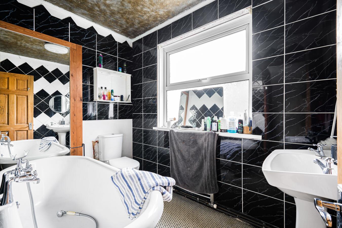 BATHROOM - comprising rolltop freestanding bath with hot and cold taps to the side with attachments. Pedestal wash hand basin with hot and cold taps. Obscured double glazed window to the side. Tiled walls. Radiator. Ceiling mounted light fitting. Door to