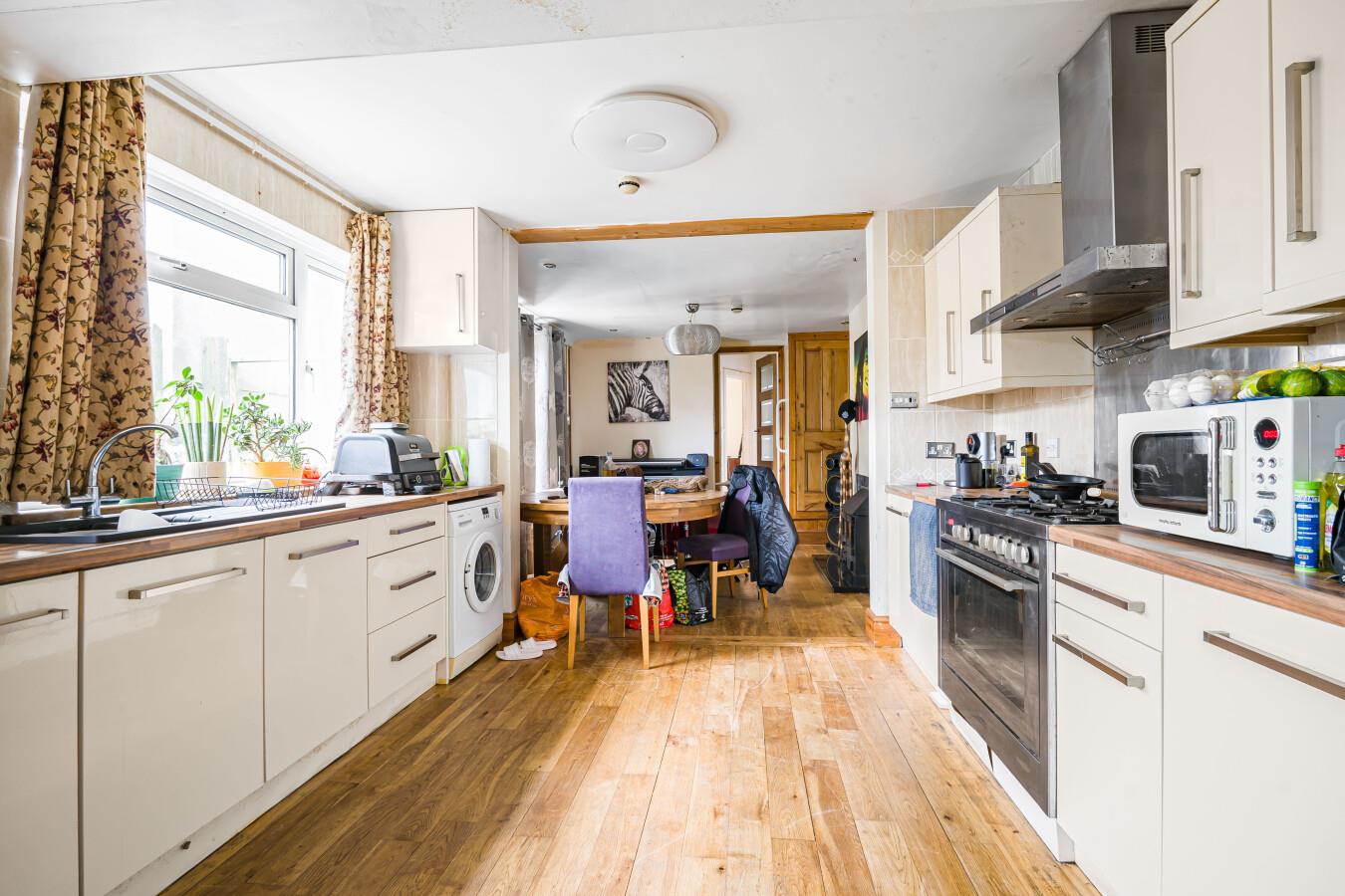 Ground Floor Flat 3a (Rear) - Double glazed entrance door leading to porch. Wooden door leading to large kitchen diner with wooden effect flooring throughout. Large six ring gas hob and electric over with AEG extractor hood over. Range of base, wall and drawer units with roll edge work surface over. Composite sink and drainer. Double glazed window to the side elevation with opening handles. Feature log burner with surround. Double glazed window to the side. Storage cupboard. Door to