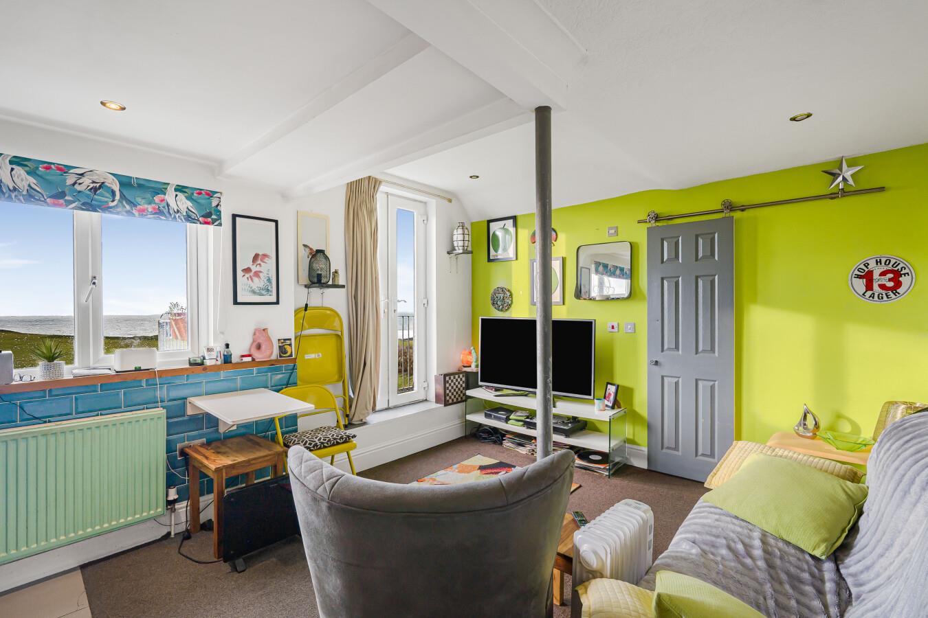 Top Floor Flat Four - Double glazed patio doors leading to Balcony with fabulous far reaching views over Newquay Golf Course and Fistral Bay beyond. Double glazed window to the front. inset ceiling light fittings. Radiator. A range of kitchen base, wall and drawer units. Inset electric oven and four ring hob. Inset circular sink with drainer and mixer tap. Wooden effect flooring. Sliding door to Bathroom. A modern shower cubicle with riser bar, hose and head. Pedestal wash hand basin. Low level WC with top flush. Door leading to bedroom. Double glazed widow to the rear with townscape views. Ceiling mounted light fitting. Storage cupboard.