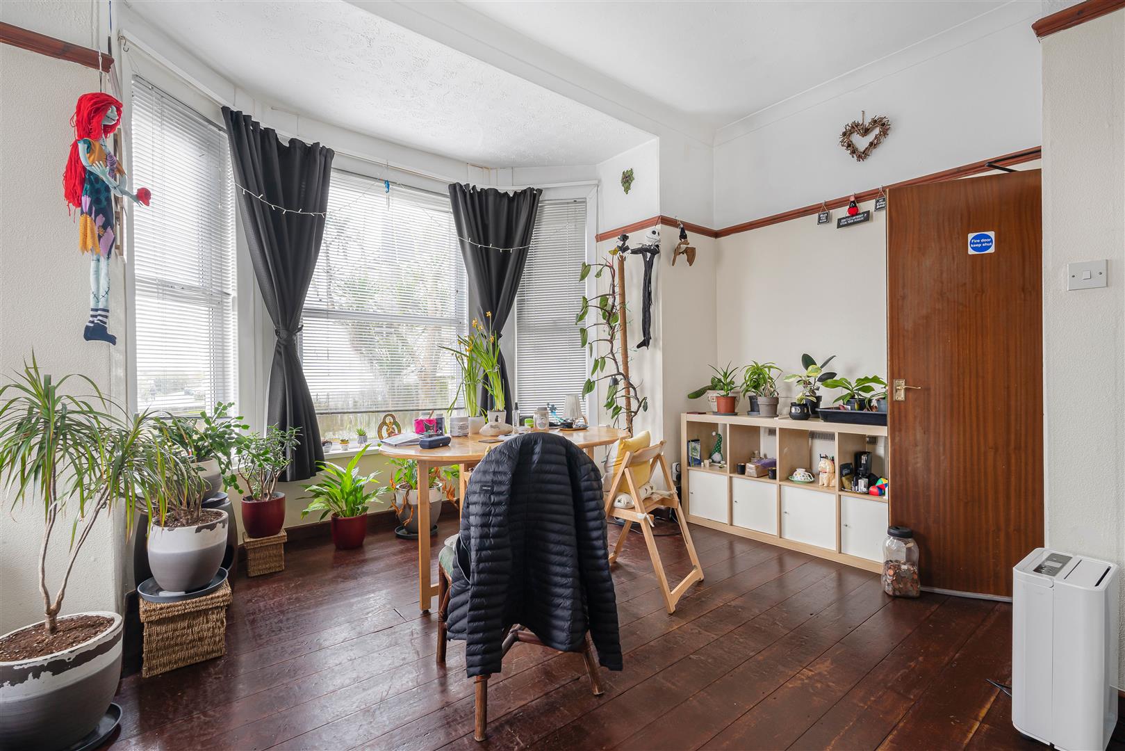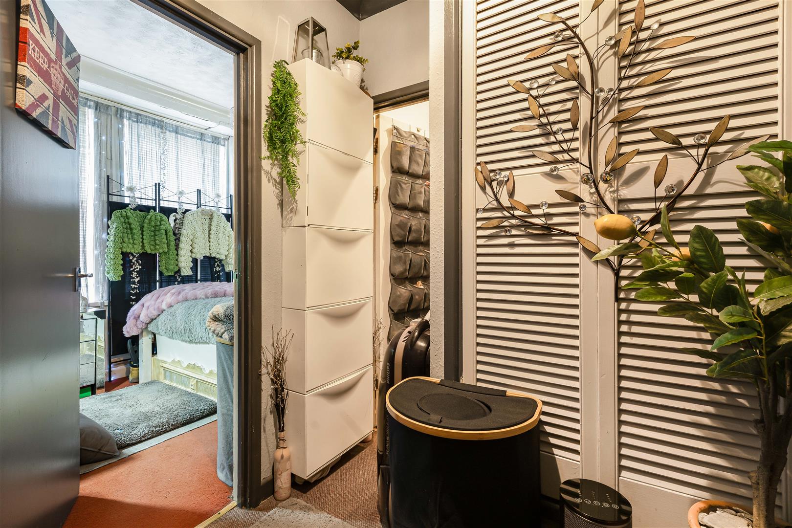 Ceiling mounted light fitting. Coat hooks. Fuse box. Fire alarm. Door leading to