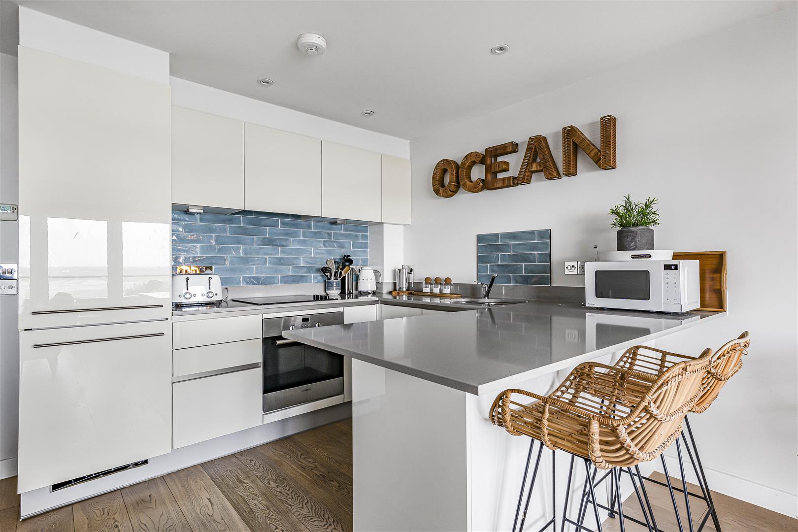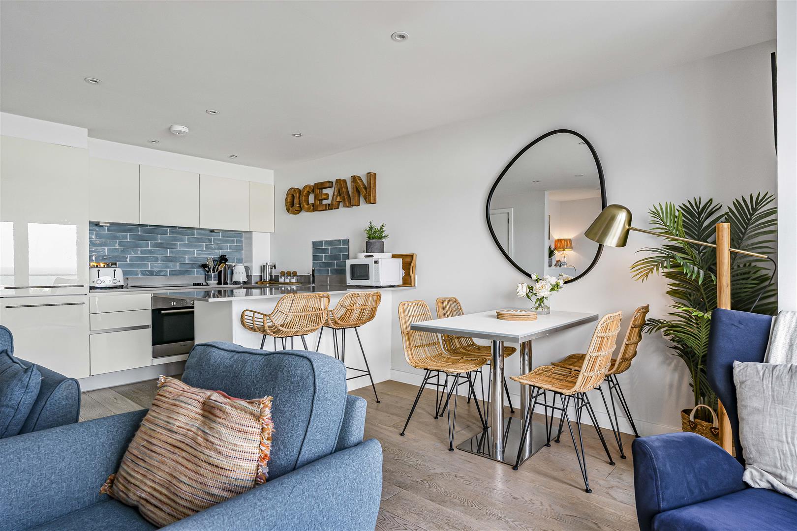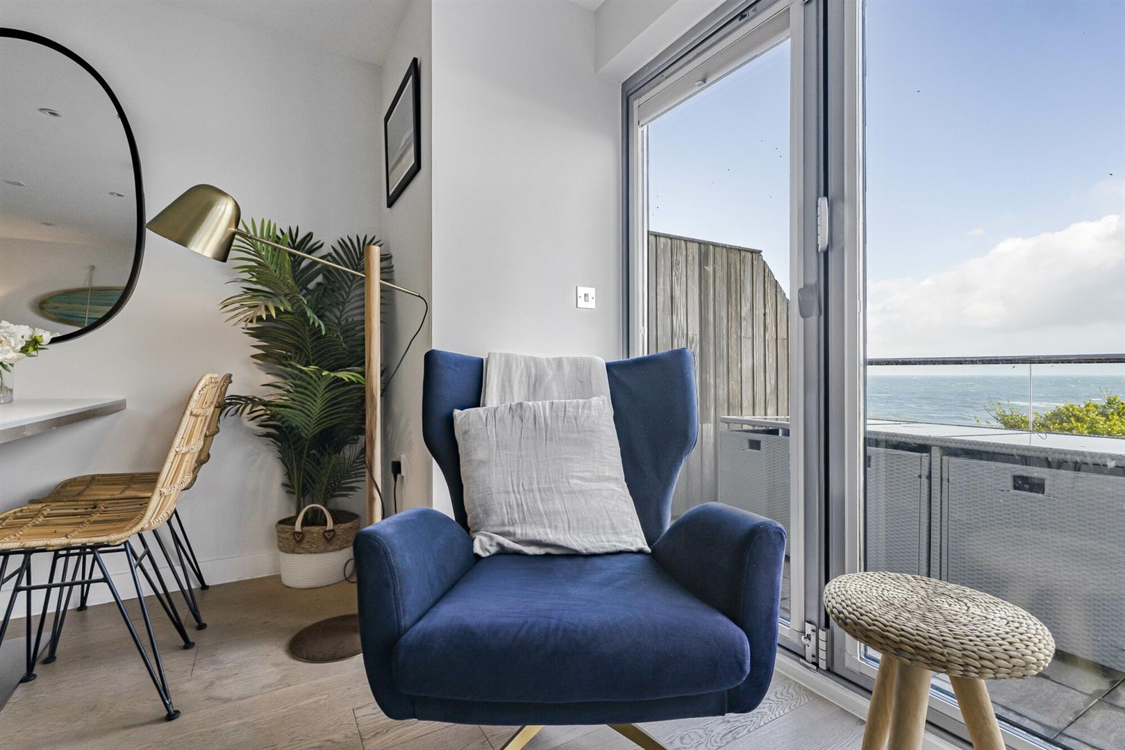 The accommodation centres around a bright and spacious open-plan living area, designed to maximise the stunning coastal outlook. Sliding doors lead directly onto the private balcony to enjoy an undoubtedly impressive vantage point to relax, dine and watch the waves roll in at the world-famous Fistral Beach. The contemporary kitchen features sleek high-gloss white units, a range of integrated appliances complimented by quartz stone worktops and completed by a stylish breakfast bar.