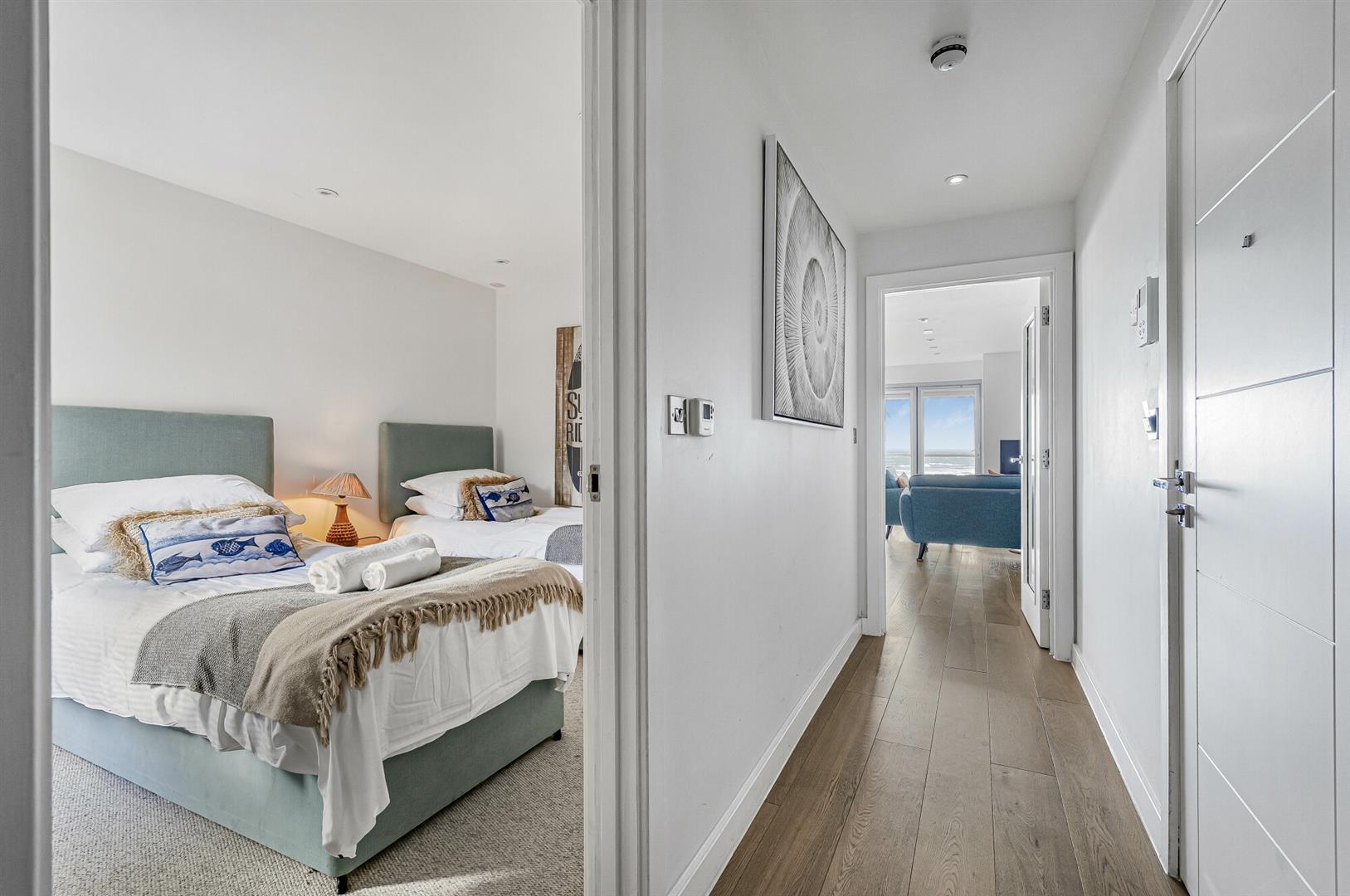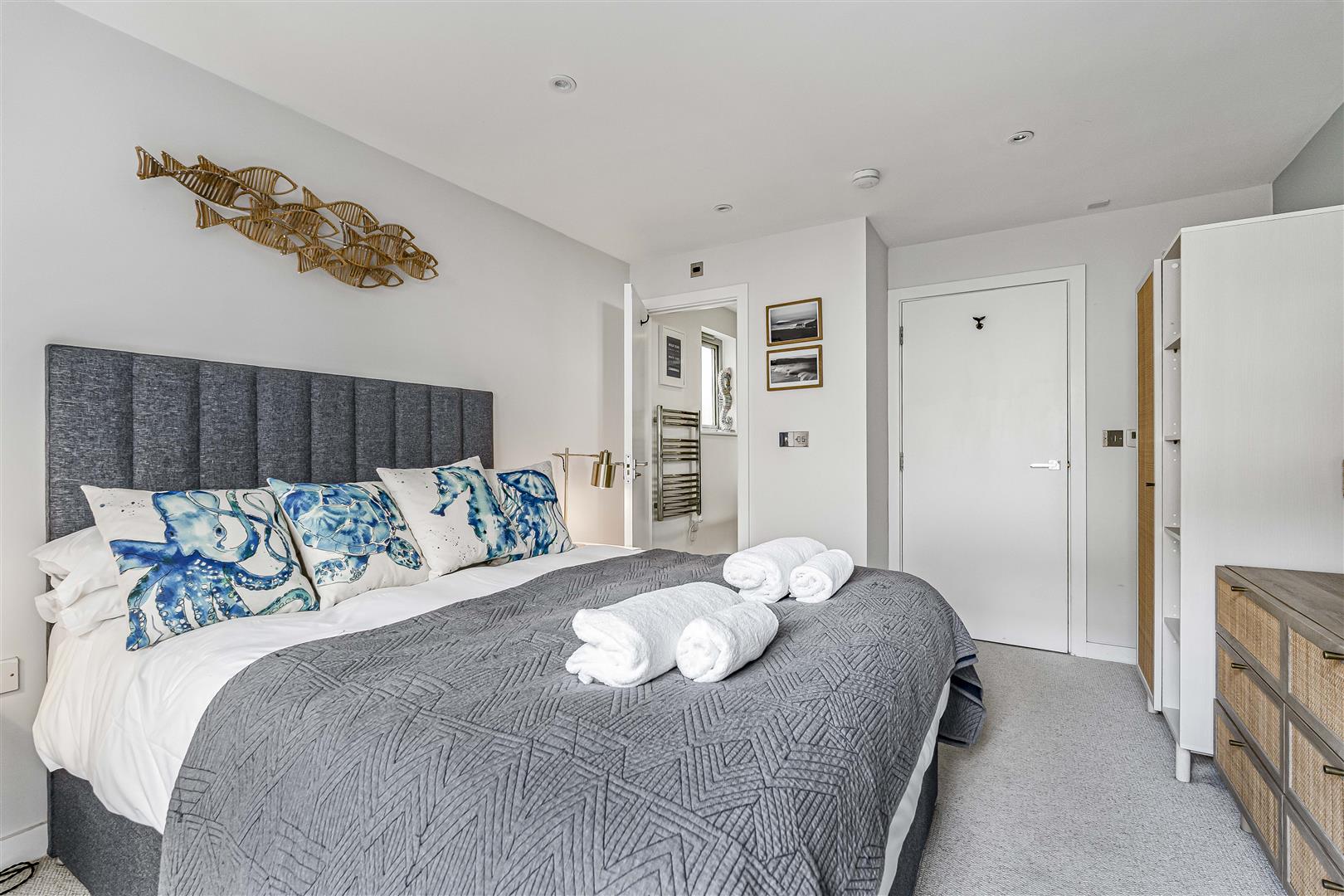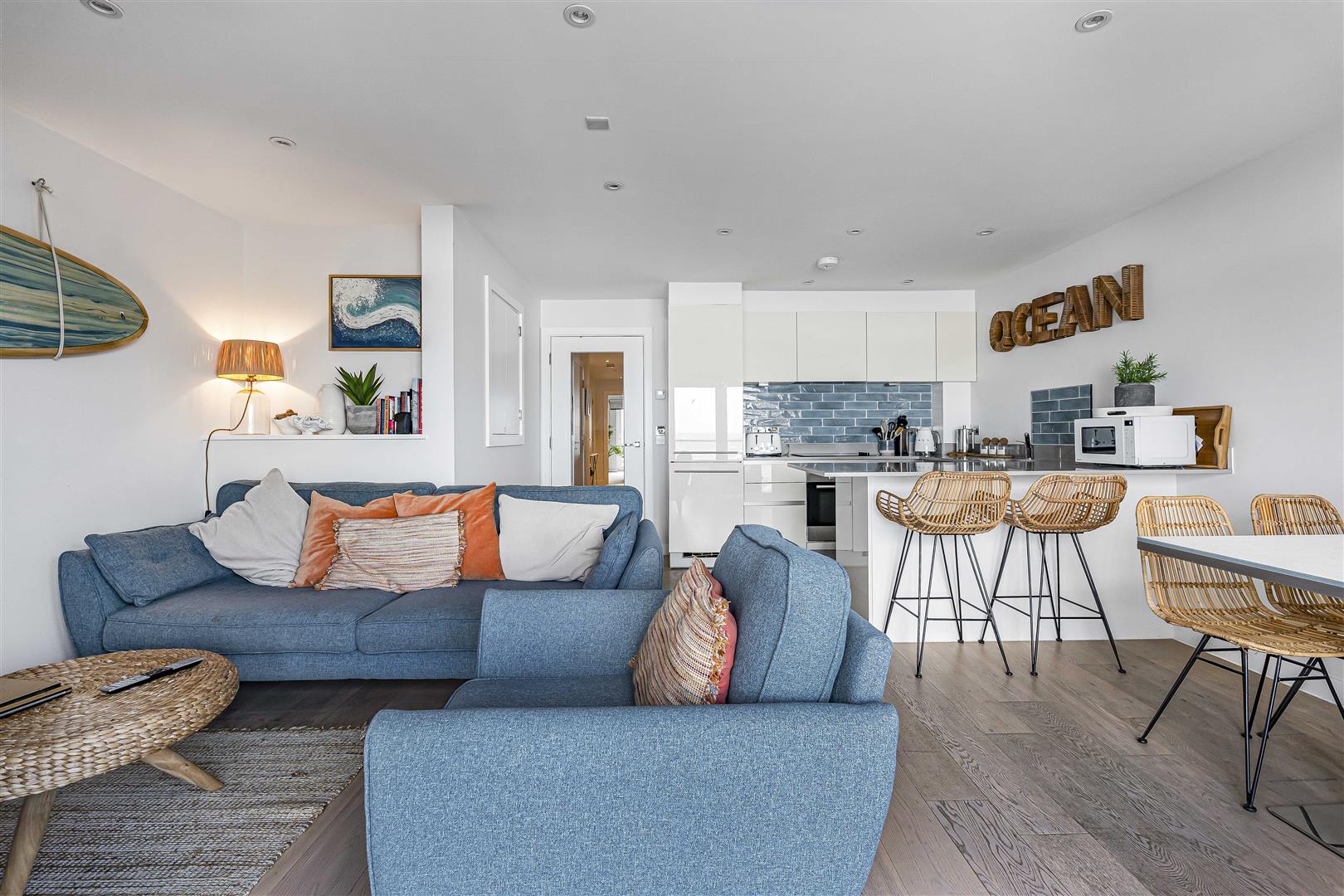 The accommodation centres around a bright and spacious open-plan living area, designed to maximise the stunning coastal outlook. Sliding doors lead directly onto the private balcony to enjoy an undoubtedly impressive vantage point to relax, dine and watch the waves roll in at the world-famous Fistral Beach. The contemporary kitchen features sleek high-gloss white units, a range of integrated appliances complimented by quartz stone worktops and completed by a stylish breakfast bar.