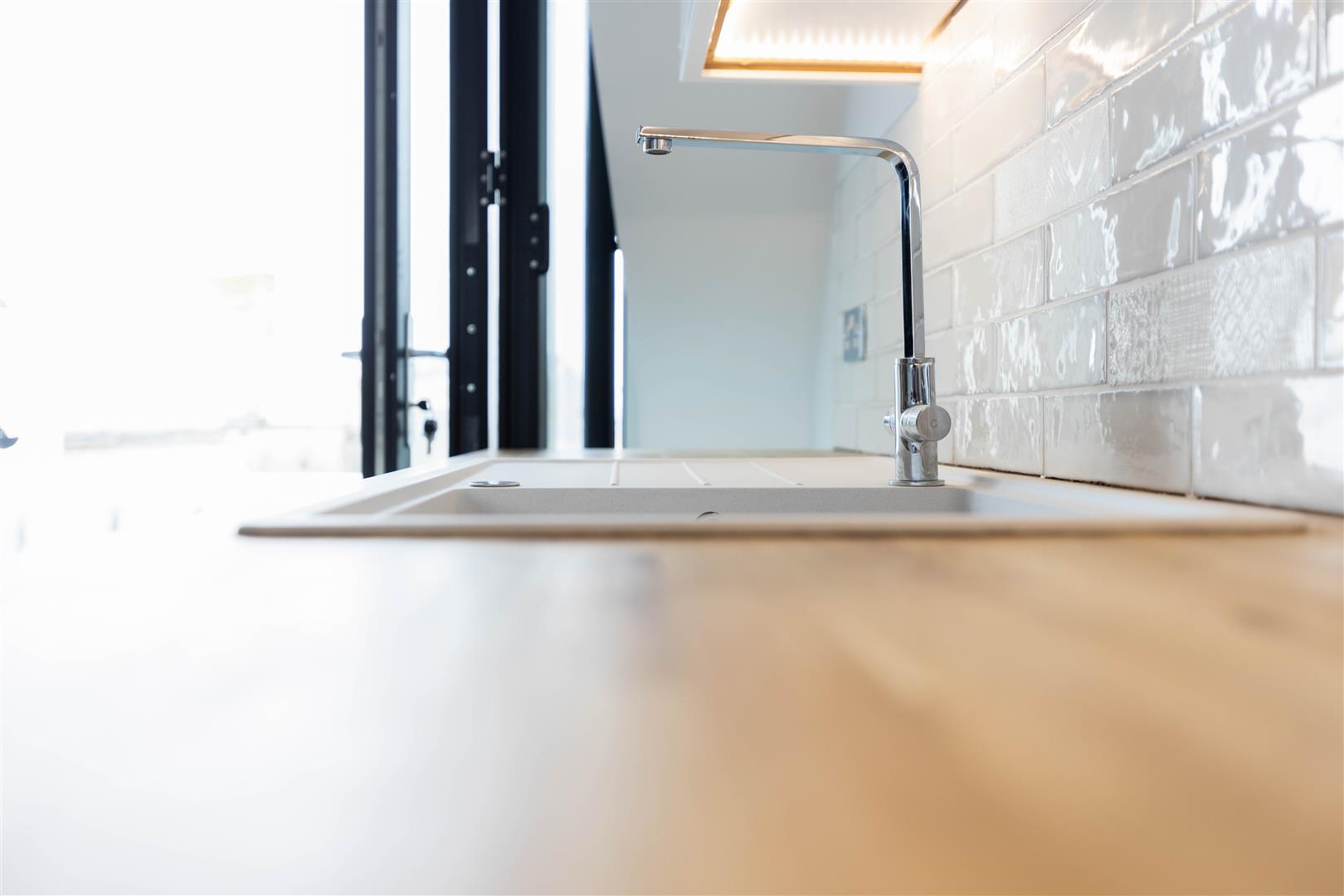 Modern fitted kitchen including wall, base and draw units with square edge solid oak work tops. A feature island with square edge solid oak worktops, the four ring electric hob and extractor also incorporating storage and a breakfast bar. Integrated washer dryer and slimline dish washer. Free standing fridge freezer. Aluminium Bi-folding doors leading to the roof terrace.