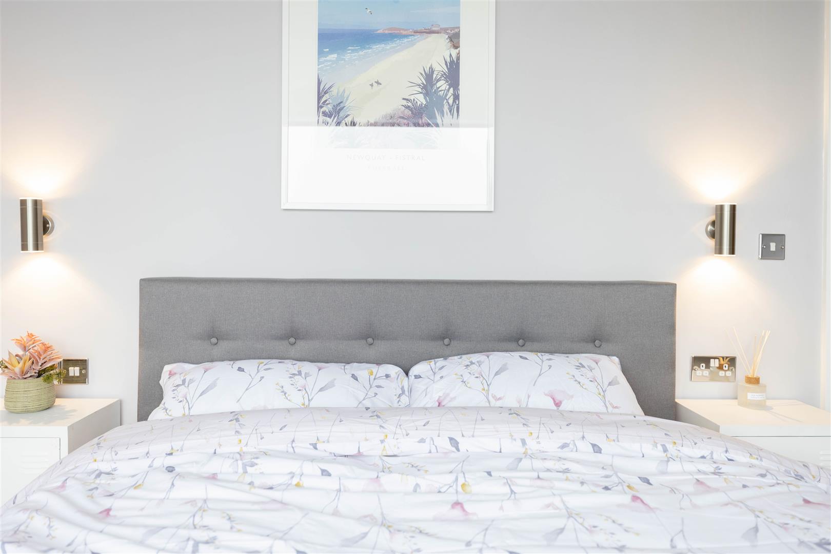Bedroom One - Access from the communal hallway. uPVC double glazed sliding windows over look roof tops and the sea towards Trevose Lighthouse. Mezzanine storage area above the king sized ottaman style bed. Efficient wall mounted electric radiator. Door to the