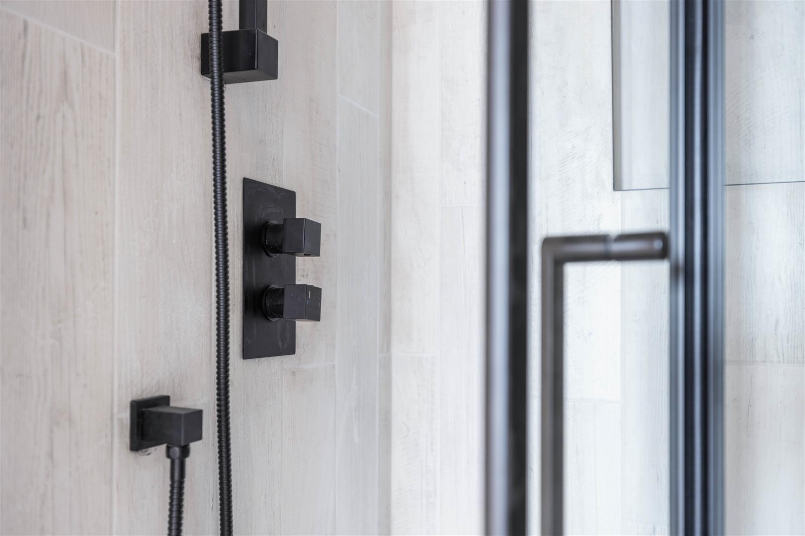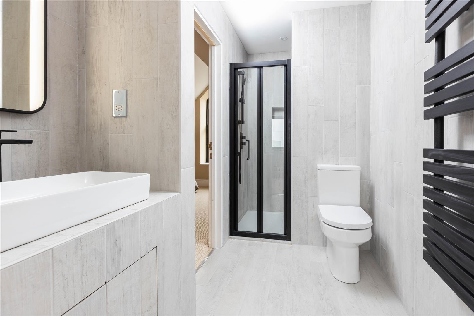 Jack and Jill En-suite - Accessed from bedroom one and two is the impeccably finished en-suite. Shower unit with glass sliding doors. Wash hand basin with mixer tap and vanity style light up wall mounted mirror above. Electric heated towel rail.