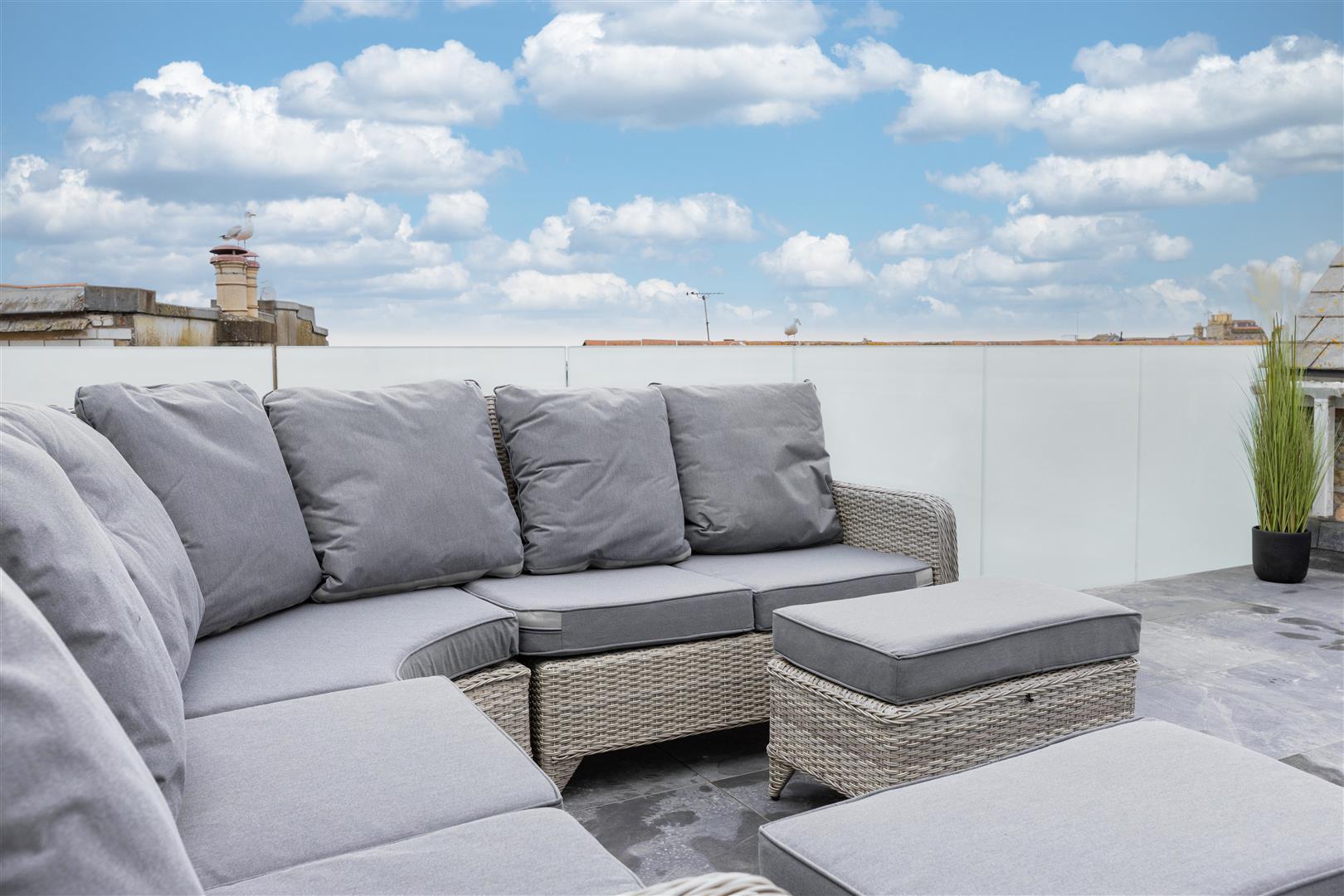 A generous roof terrace perfect for entertaining and appreciating the rooftop sea views across to Trevose Lighthouse with frameless frosted glass balustrade.