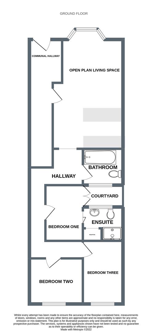 Open plan living space with sea glimpses, three bedrooms, family bathroom, ensuite and small courtyard.