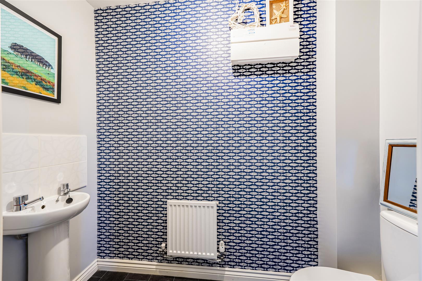 Cloakroom - Close coupled WC with dual flush. Pedestal wash hand basin tiled splash back. Radiator.