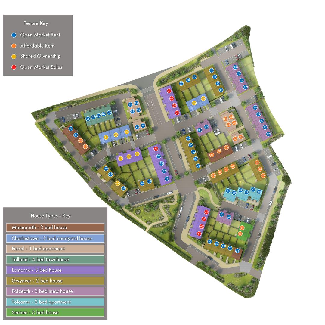 The Development - Treveth, a Cornish developer established in 2019, is committed to creating high-quality homes and sustainable communities that address local housing needs. As a Certified B Corporation (B Corp), Treveth upholds the highest standards of social and environmental performance, accountability, and transparency, reinforcing their dedication to responsible development. Their Hedhas Dowr development in Trevemper, Newquay, features 96 thoughtfully designed homes, including one and two-bedroom flats, bungalows, and two to four-bedroom houses, catering to individuals, couples, and families. Offering a range of tenures, such as shared ownership, affordable rent, open market rent, and social housing, the development ensures accessibility and flexibility for a diverse range of residents. Treveth also retains the estate management and other tenures to ensure estates are continually maintained to high standards, fostering a sense of community and long-term sustainability. Designed with a focus on quality, sustainability, and harmony with the surrounding Cornish landscape, Hedhas Dowr reflects Treveth’s mission to create practical, attractive homes and foster thriving communities.