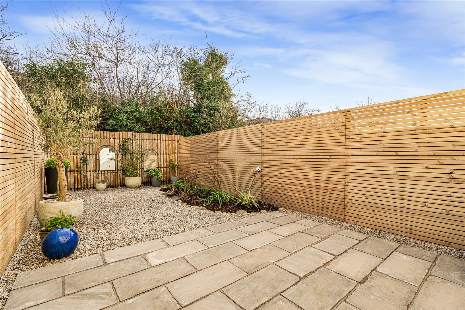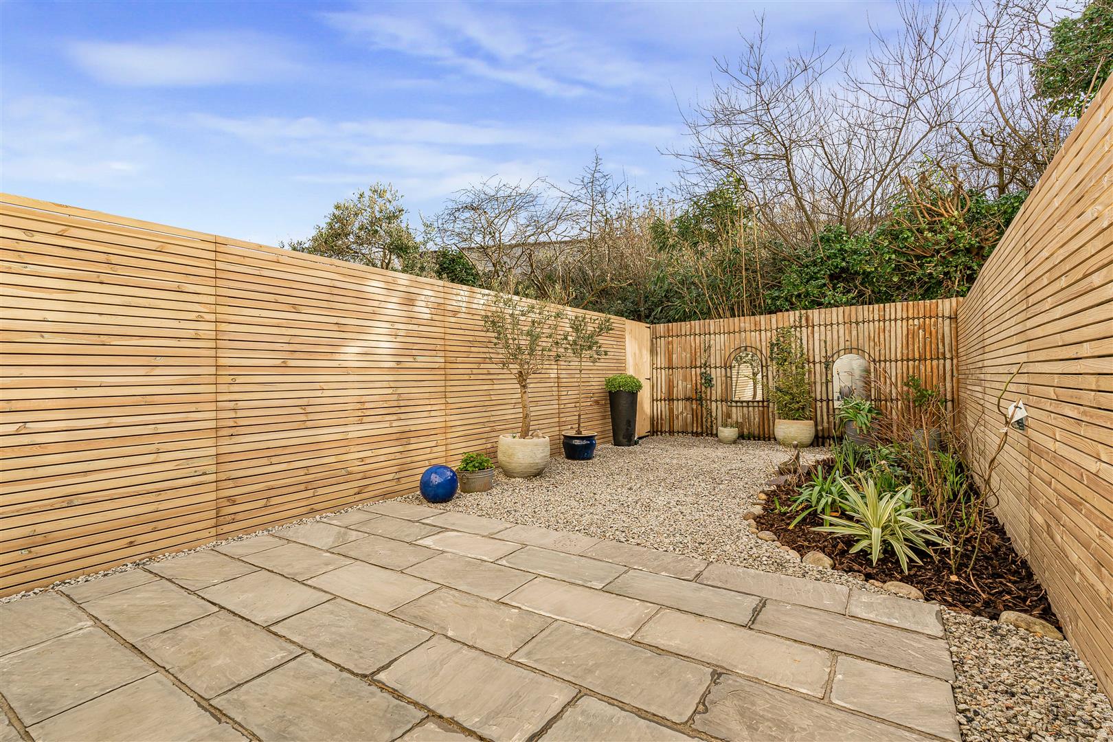 EXTERIOR - Externally, the garden faces southerly, a real sun-trap and very low maintenance with a large patio and an area of stone hippings; it's private, sheltered and enclosed. At the front, there's driveway parking for one car. Garage with electric door over.