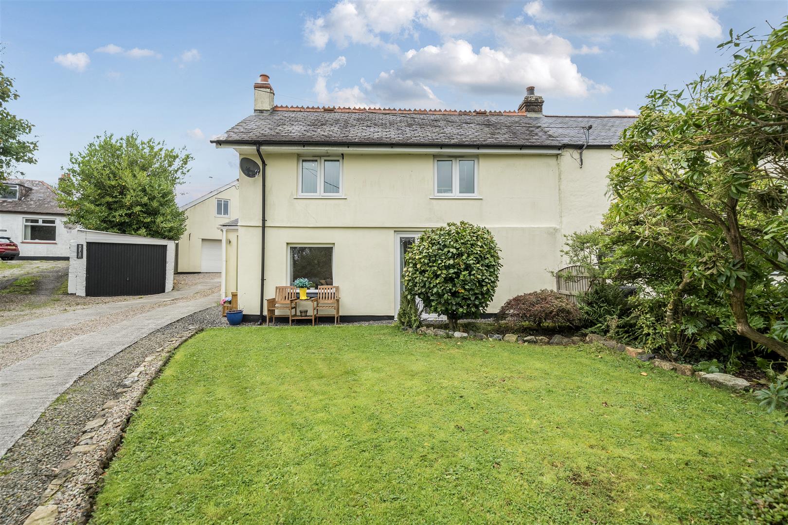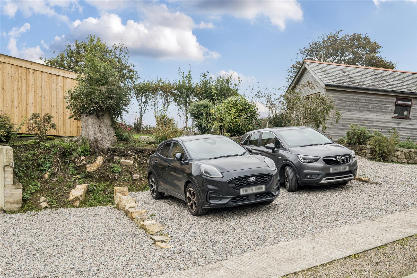 EXTERNAL - The property is approached via a long sweeping driveway, providing parking for up to two vehicles. To the front, a generous garden is framed by mature shrubs and hedging, creating a sense of privacy and charm. The rear garden is beautifully landscaped, beginning with a decorative stone terrace that rises to a tiered lawn. Beyond this, further stone and shrub borders lead to an elevated deck and summerhouse an ideal spot to relax and enjoy the afternoon and evening sun.