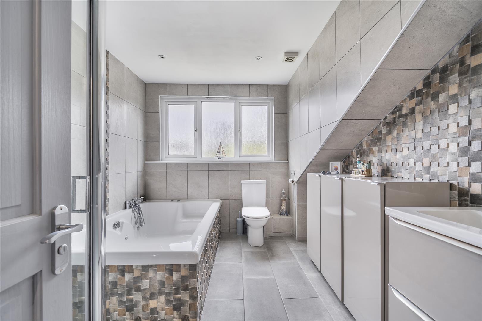 The dining area, situated at the far end of the kitchen, offers ample room for entertaining and includes a relaxed snug space. Sliding doors open onto a stone-chipped terrace, perfectly suited to outdoor seating and al fresco dining. The main living room overlooks the front garden and is a generous, welcoming space. French doors lead directly outside, while solid oak flooring, a central log burner with wood surround, and room for family-sized furnishings create a homely yet elegant setting. Upstairs, natural light streams through a stairwell skylight. Three excellent double bedrooms all benefit from built-in wardrobes, with the master also providing loft access to a fully boarded storage space via fitted ladder. The family bathroom has been finished to a high standard and features a luxurious double jacuzzi bath, separate double shower with waterfall and power attachments, vanity sink with storage, and a low-level W/C.