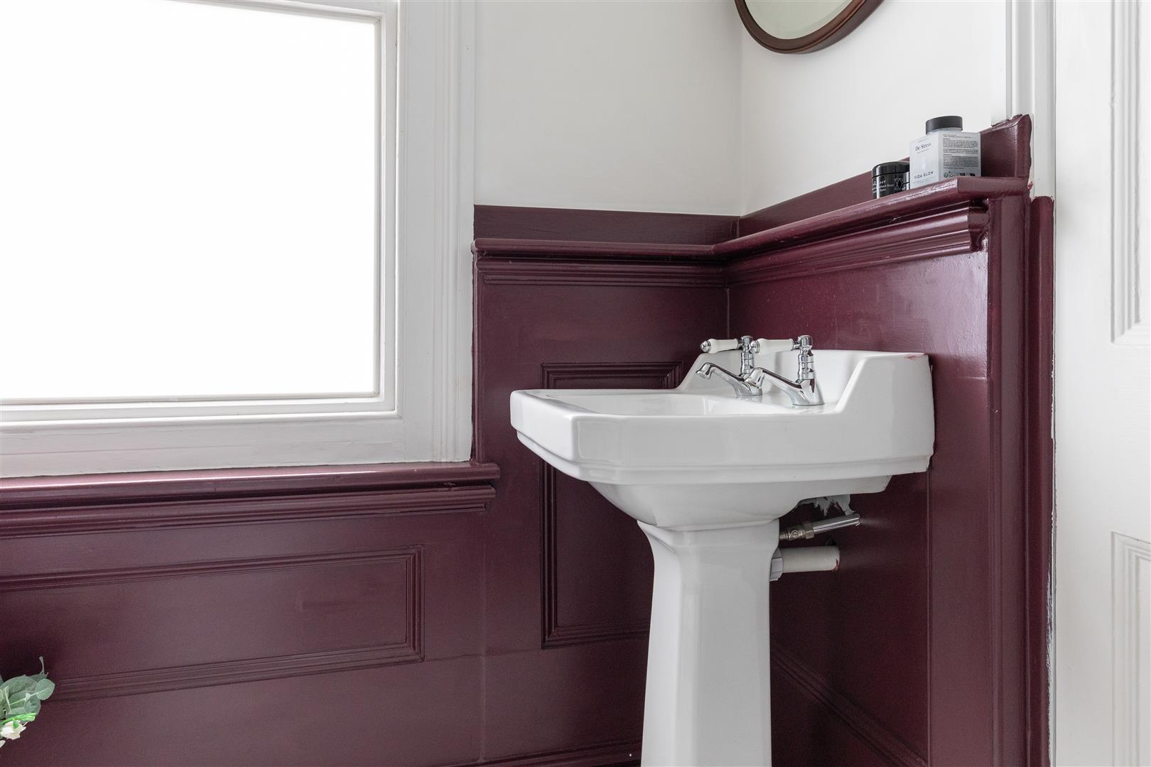 FAMILY BATHROOM - Two single glazed opaque sash windows to the side elevation. Single panel bath with electric overhead shower, glass screen, mains mixer tap and hose. Close coupled WC. Pedestal wash hand basin. Fully tiled around bath area. Tiled flooring. Period style radiator with incorporated heated towel rail. Extractor.
