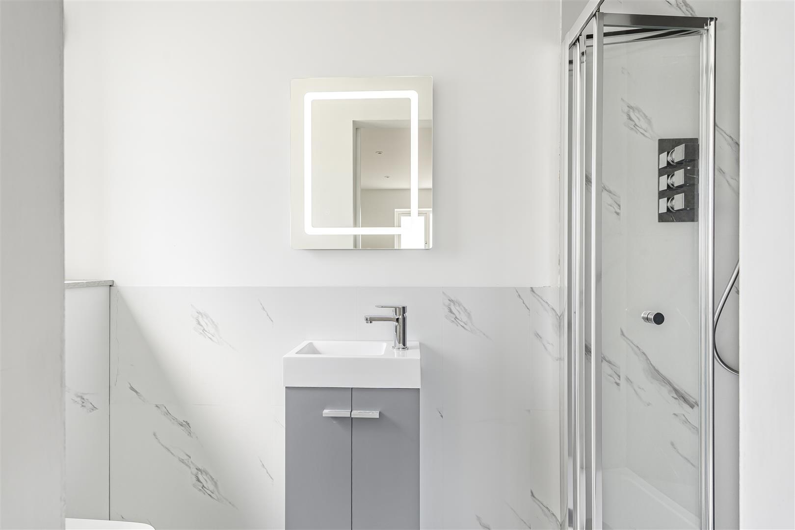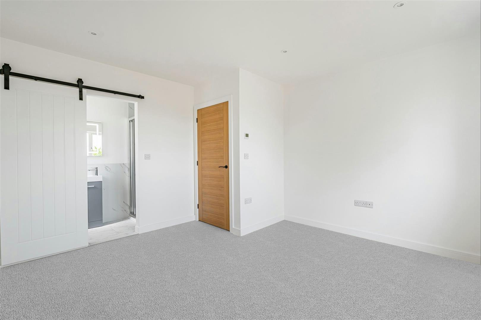 The Property - Entering through the composite front door, you’re welcomed by a spacious hallway with ample room for neatly storing coats and shoes beneath the staircase. The ground floor is finished with oak-effect herringbone LVT flooring, complete with underfloor heating that runs throughout the entire level. Just off the hallway is a convenient downstairs WC, and a generously sized double bedroom featuring an en-suite. The en-suite includes a bi-fold glass shower unit, a wash basin with integrated storage, an LED-lit vanity mirror, and a low-level WC. A sliding wooden door to the en-suite maximises usable space within the bedroom.