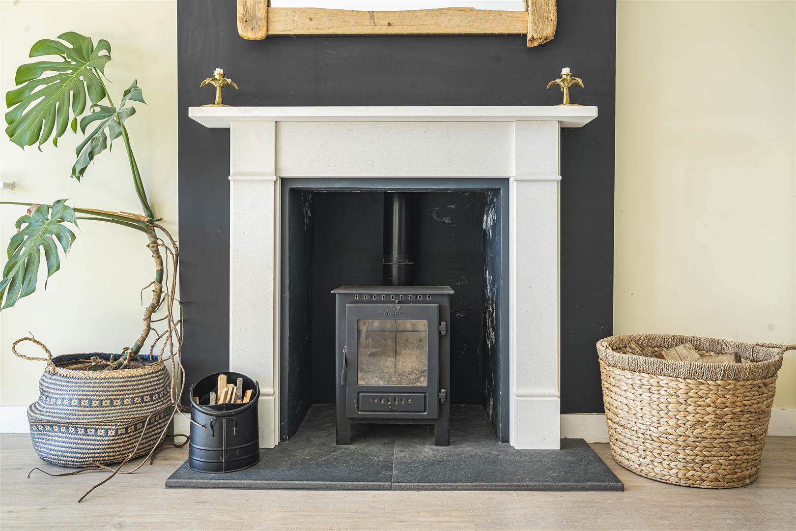The separate lounge offers a cosy yet spacious room, with a striking feature fireplace housing an ESSE log burner, complemented by a slate hearth and stone surround. Sliding doors provide direct access to the rear garden and allow natural light to flood the space. A downstairs WC completes the ground floor accommodation.