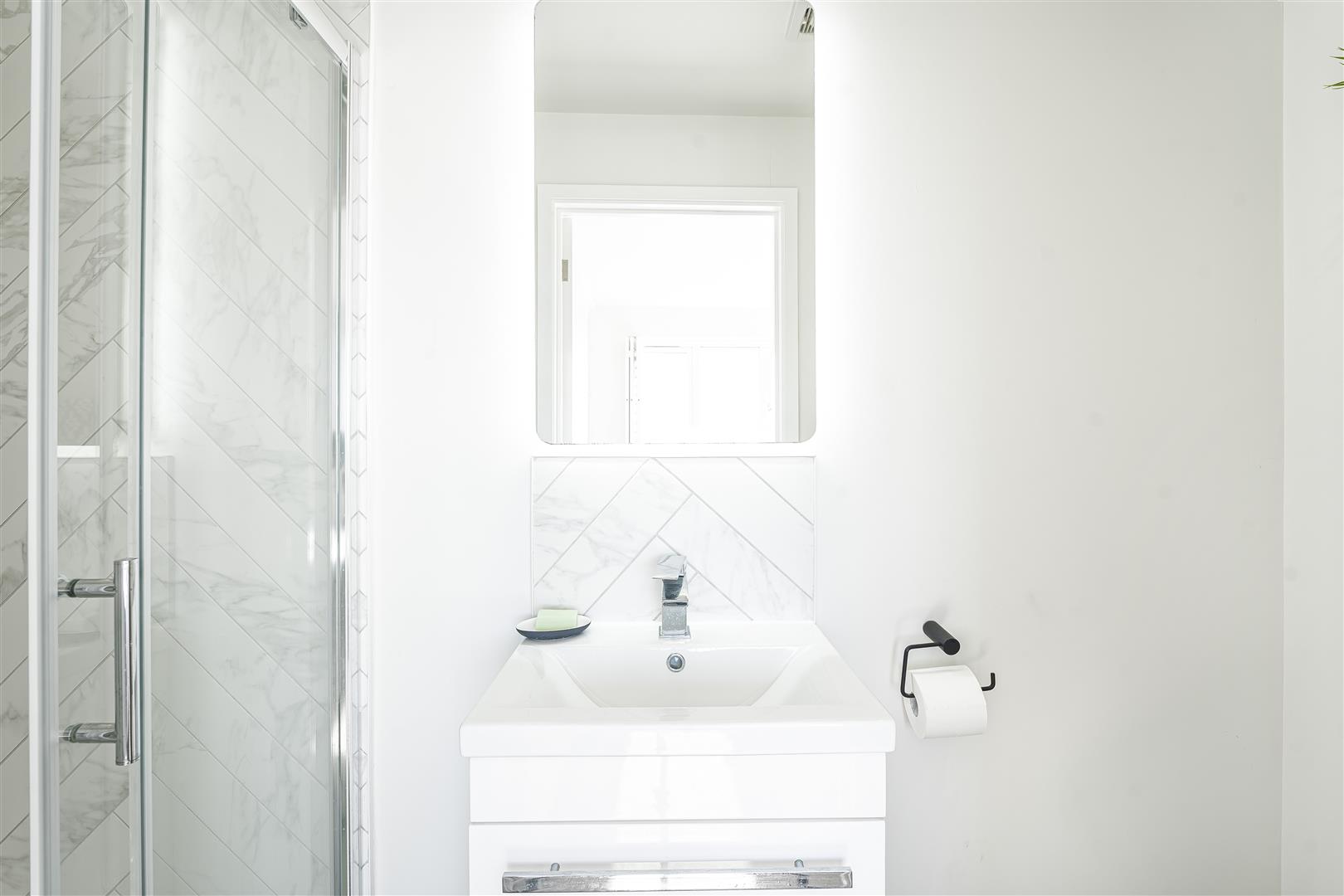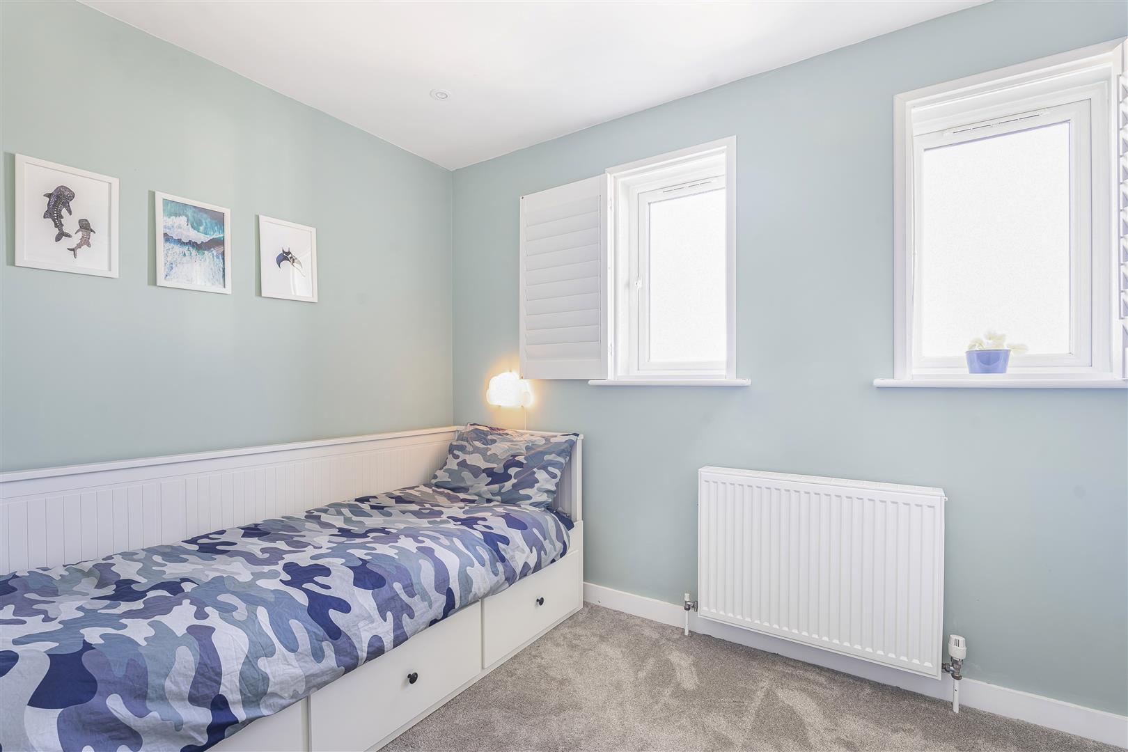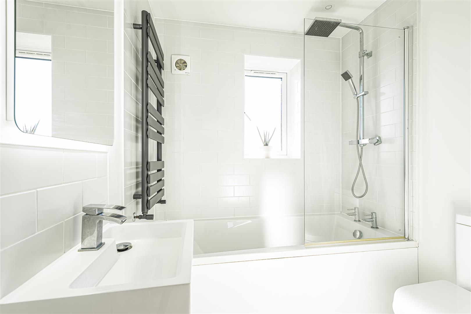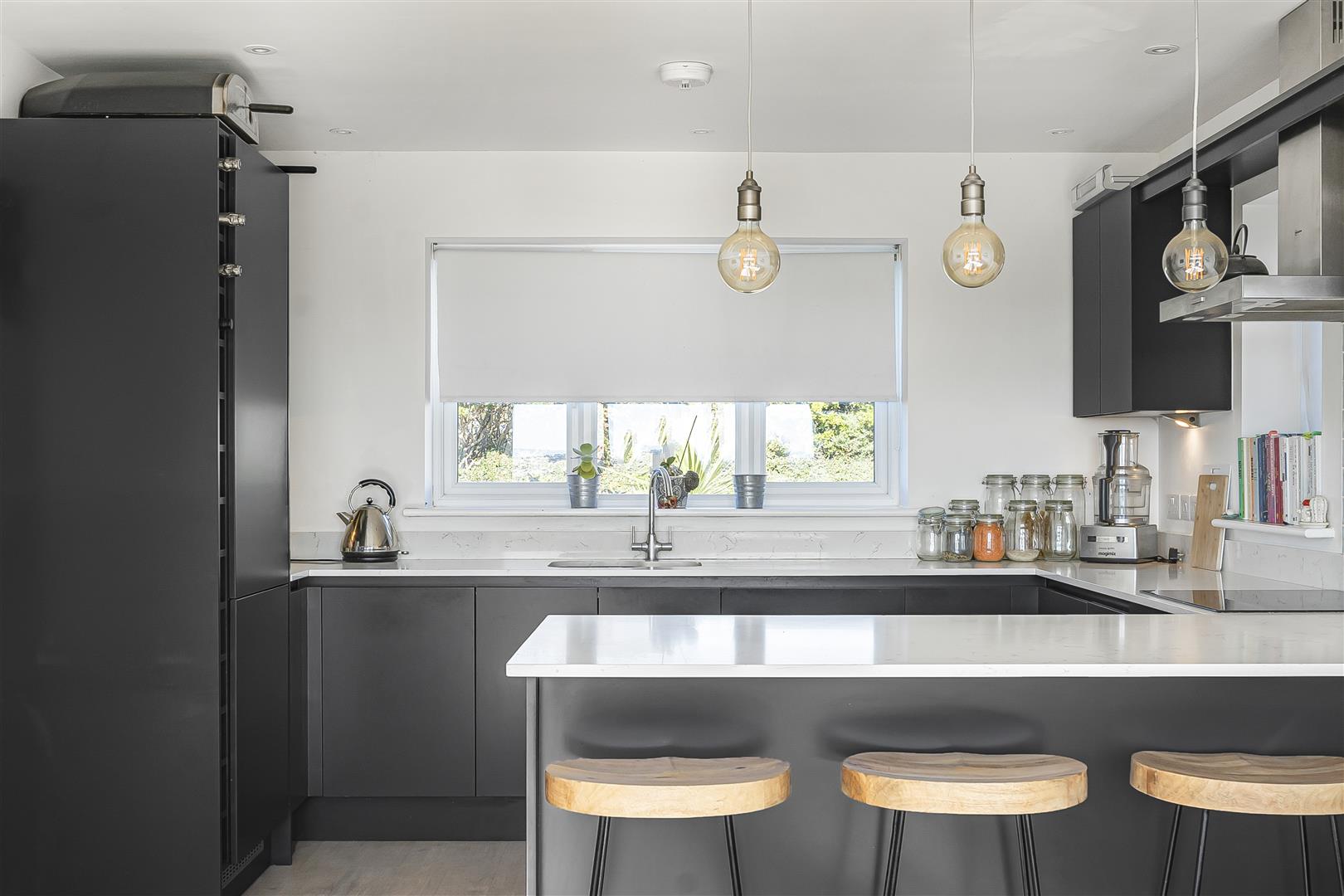 At the heart of the home lies the kitchen/dining room - a superb entertaining space finished with quartz stone worktops in matt obsidian grey. A peninsula breakfast bar provides casual seating, while integrated appliances include a dishwasher, fridge freezer, as well as a Neff oven and hob. Sliding doors extend the space out onto a raised sun deck and the rear garden, ideal for al fresco dining. There is also access to a practical utility room, fitted with undercounter space for a washing machine and tumble dryer, which offers an additional door into the rear garden.