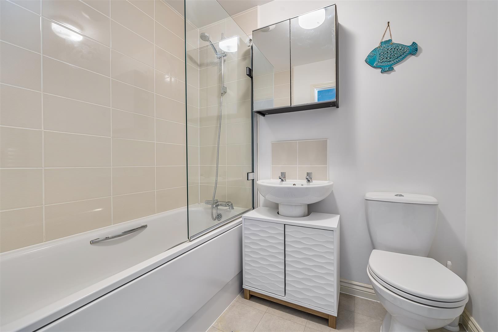 BATHROOM - The family bathroom features a full-length bath with a side panel, mixer tap, and shower attachment. Close coupled W/C. Wash hand basin. Towel rail.