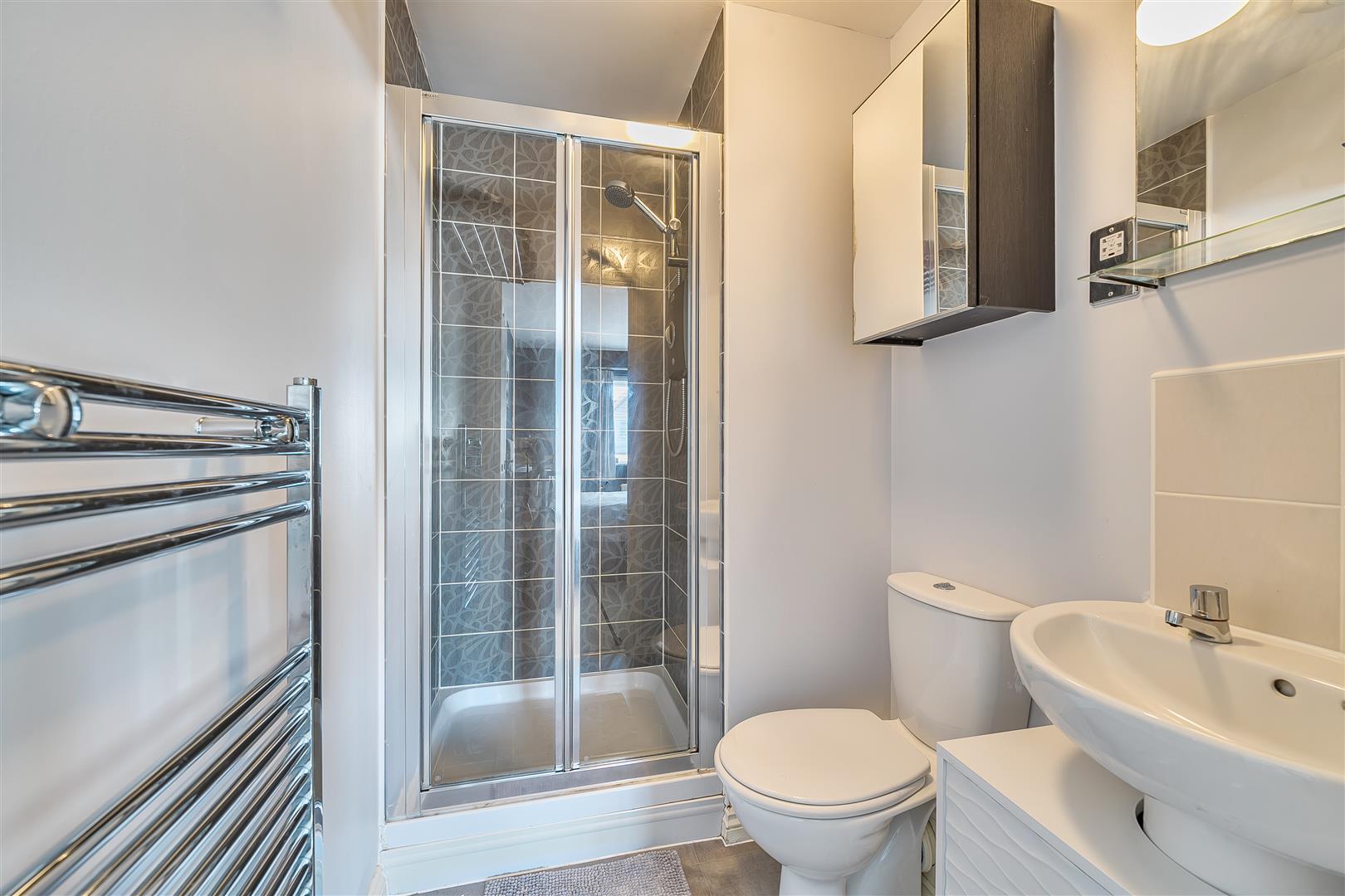 EN-SUITE - Double glazed obscured window to the front aspect. W/C with wash hand basin. Walk in shower with shower over. Heated towel rail.