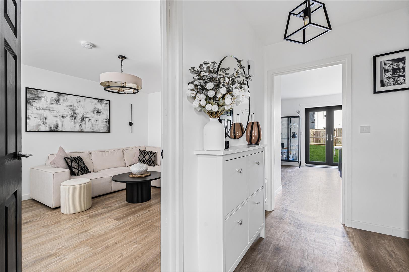 On entering the property, the welcoming hallway provides access to the ground floor accommodation, which includes a useful utility room with space for white goods, a comfortable living room, and a generous kitchen/dining room. The stylishly fitted kitchen is well appointed with an electric cooker and hob, dishwasher, and space for a fridge/freezer. Patio doors from the kitchen/dining area open onto the large rear garden, creating an ideal space for entertaining and family life.