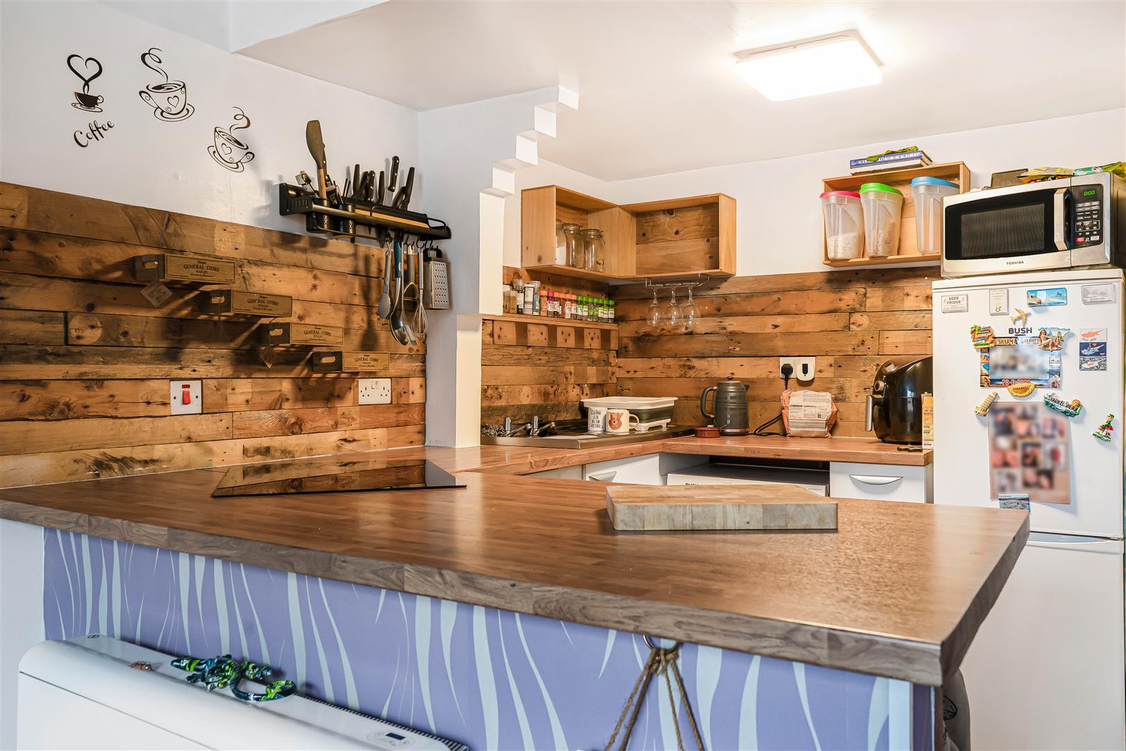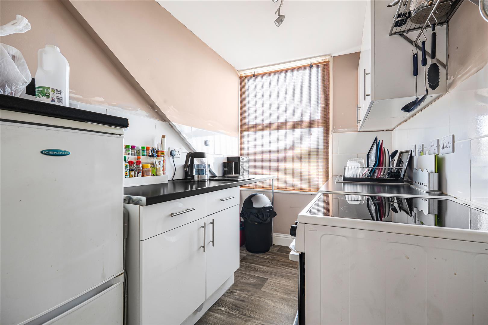 Flat Two (First Floor) - Kitchen Area. Range of base units with work surface. Built in electric oven with four ring electric hob. Extractor hood over. Range of shelving. Ceiling mounted light fitting. Stainless steel sink and drainer with hot and cold mixer tap. Loft access.