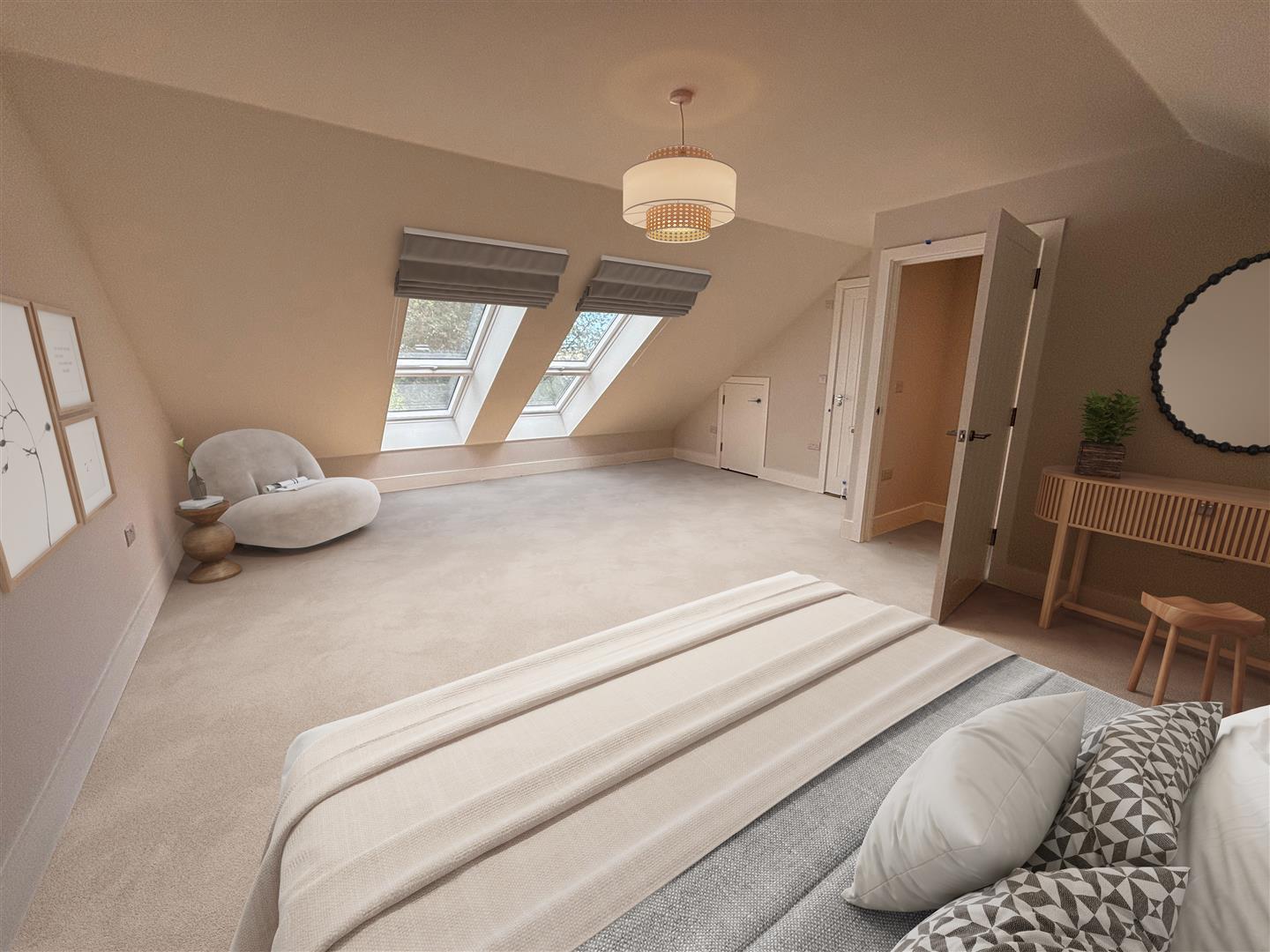 The standout feature is the entire top floor, dedicated to a luxurious principal suite complete with a stylish en suite, double sinks and premium sanitaryware, with woodland views through twin skylights.