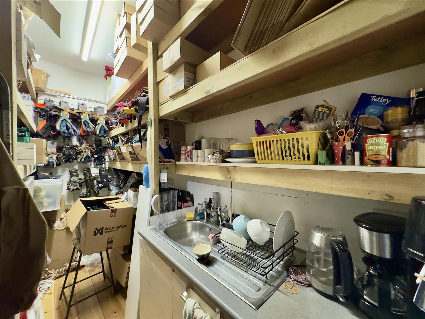 Storage/Kitchen - Wooden effect flooring. Range of shelving and storage. Stainless steel sink and drainer with hot and cold taps. Florescent strip lighting. Power points. Door to
