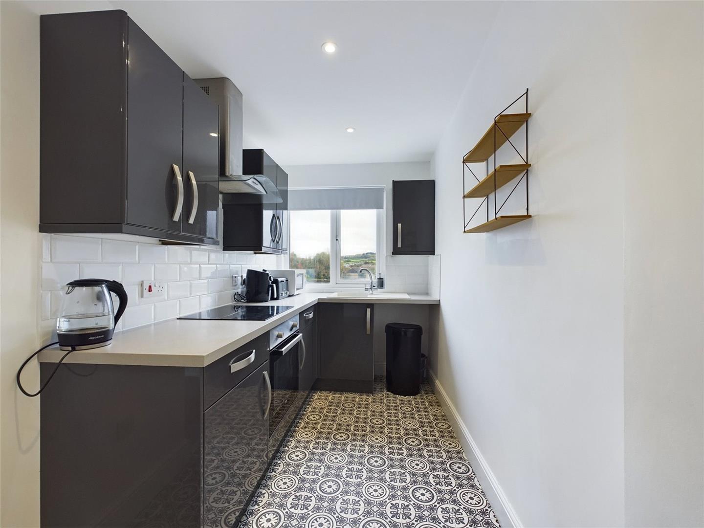Kitchen (irregular in shape) - A range of base, drawer and wall units. Integrated hob and electric oven. Composite sink and drainer with hot and cold mixer tap. Shelving and storage. Range of power points.