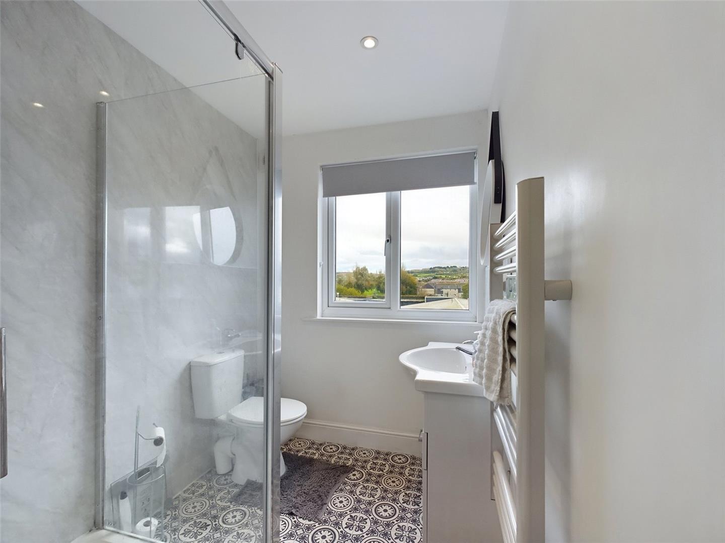 Bathroom - Shower cubicle with electric shower,. Low level WC with top flush. Double glazed window to the rear. Inset ceiling spot lighting. Vanity sink with mixer tap. Ladder radiator.